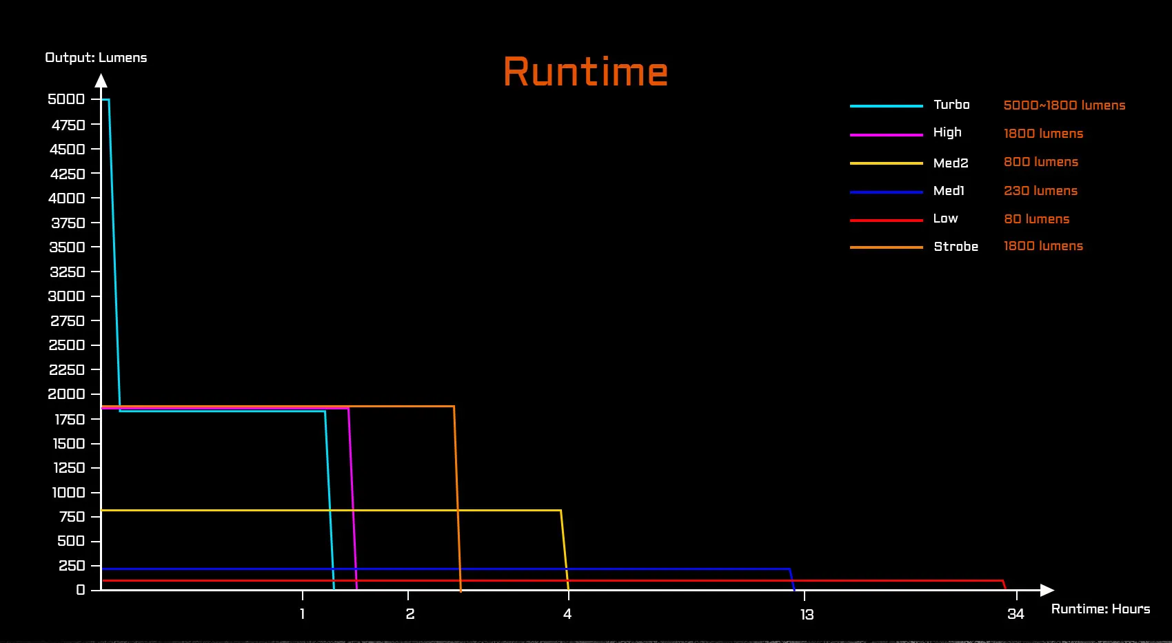 Turbo: 5000~1800 lumens; 105625cd; 650 meters; 1 min + 1 hour 15 minutes